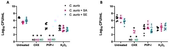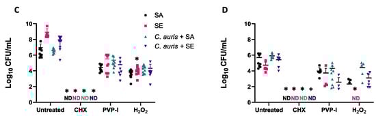 As single and dual-species biofilms of both bacteria and fungi are typically associated with an increased tolerance to antimicrobial challenges, we next sought to test the ability of such biofilms to tolerate antiseptics. In all cases, the mean number of fungi and bacteria in each biofilm was reduced by at least 2 × log10 CFU/mL following treatment (Figure 3). CHX displayed the highest efficiency by significantly reducing viable cells of both S. aureus, S. epidermidis, as well as C. auris by more than 4 × log10 (p < 0.05). H2O2 was the least effective against fungi within single and multi-species biofilm environments. H2O2 prevented the growth of S. epidermidis biofilms when grown on cellulose matrices (Figure 3D), but all other biofilms survived treatment with more than 1 × 102 CFU/mL remaining within the biofilm. Treatments with 10% PVP-I were able to reduce biofilm viability and also showed a greater efficacy against C. auris biofilms grown on plastic coverslips compared to cellulose matrices (Figure 3A; p < 0.05).