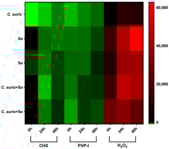 Herein, we demonstrated a reduced activity of H2O2 against single and dual-species biofilms and similar findings have been reported elsewhere [3]. C. auris has been reported to contain catalase genes while both S. aureus and S. epidermidis display catalase activity that can be utilized as a survival factor against osmotic stressors and a H2O2 challenge, indicating why H2O2 is less effective than CHX and PVP-I [12,13,14].