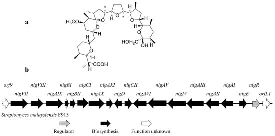 Polyether antibiotics are a unique class of ionophores with metal ion-binding ability and lipophilic characteristics [13]. One major worldwide commercial use of polyether antibiotics is to control coccidiosis in animal husbandry [14,15]. The first discovered carboxyl polyether antibiotic was nigericin (Figure 1a). It has the ability to selectively transport ions across cell membranes and is widely used as a research tool to disrupt intracellular H+ and K+ concentration [16,17]. Nigericin is reported to be a potent agent against a variety of multidrug-resistant strains of pathogens, including Paecilomyces variotii and Candida albicans [18]. In vivo and in vitro assays have also proved that nigericin exerts strong selective antitumor activities [19,20]. The entire gene cluster for nigericin biosynthesis was firstly cloned from Streptomyces sp. DSM4137; the biosynthetic pathway of nigericin was proposed based on analyses of intermediates accumulated in disruption mutants of several structural genes [21]. However, the regulation mechanism of nigericin biosynthesis is still unknown, rendering improvement of the production of nigericin production by genetic engineering problematic. Streptomyces malaysiensis F913 is a soil-borne actinomycete with high algicidal activity [22]. Whole genome scanning suggested that S. malaysiensis F913 has a nigericin biosynthetic gene cluster (nig gene cluster) which showed high synteny with the reported homologous gene cluster in Streptomyces sp. DSM413. In this paper, we determined the role of the only regulatory gene, nigR, in the nigericin biosynthesis gene cluster in S. malaysiensis F913. The results suggest that NigR positively regulated nigericin biosynthesis by activating the transcription of structural genes. Overexpression of nigR significantly improved nigericin production.