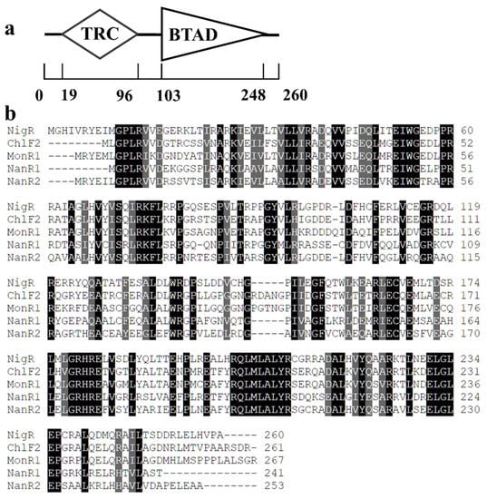 Identification of NigR in S. malaysiensis. (a) Predicted domain structure of NigR. TRC, trans-Reg-C domain; BTAD, bacterial transcriptional activator domain; (b) Amino acid alignment of NigR and its orthologs. Identical or similar residues in all sequences are highlighted in black and gray, respectively. Examples of orthologs include: ChlF2 for chlorothricin from S. antibioticus, MonR1 for monensin from S. cinnamonensis, NanR1 and NanR2 for nanchangmycin from S. nanchangensis.