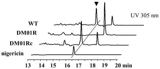 HPLC analysis of nigericin produced by S. malaysiensis F913 and its derivatives. WT, fermentation broth from S. malaysiensis F913; DM01R, fermentation broth from S. malaysiensis nigR disruption mutant; DM01Rc, fermentation broth from S. malaysiensis nigR complementation strain; nigericin: nigericin standard sample. The retention time for nigericin was about 16.7 min, indicated by triangle in WT.