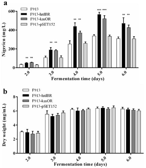 Effects of nigR overexpression on nigericin production. (a) Nigericin production; (b) Dry weight in liquid culture. Data are presented as the averages of three independent experiments conducted in triplicate. Error bars show standard deviations from three replicates. Student’s t -test is used to determine the p-values. Significant difference: ** p < 0.01, *** p < 0.001.