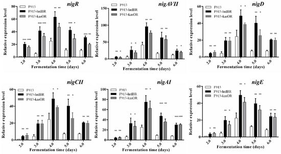 qRT-PCR analysis of selected genes in nigericin biosynthesis. The expression level of samples collected from the F913 strain at fermentation day 2 was assigned a value of 1; the expression levels of nigR, nigAVII, nigD, nigCII, nigAI and nigE in in all samples are presented relative to that of samples collected from the F913 strain at fermentation day 2. Error bars show standard deviations from three independent experiments. A Student’s t-test was used to determine the p-values. Significant difference: * p < 0.05, ** p < 0.01, *** p < 0.001.