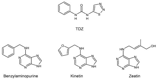 - Huetteman, C.A.; Preece, J.E. Thidiazuron: A potent cytokinin for woody plant tissue culture. Plant Cell Tissue Organ Cult. 1993, 33, 105–119. [Google Scholar] [CrossRef]