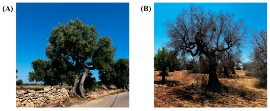 Xylella fastidiosa (Xf) is a non-spore-forming Gram-negative phytopathogenic bacterium belonging to the Xanthomonadaceae family, colonizing the xylem vessels of almost 600 plant species—275 genera and 85 families [23]. Though the world is concentrated on coronavirus disease 2019 (COVID-19) [24], the current impact of Xf in many parts of the world is now considerable [25] and causes the disease in a number of important crops and plants within natural ecosystems. The Xf symptoms are leaf scorching, wilting of the foliage, defoliation, chlorosis or bronzing along the leaf margin, and dwarfing [26]. Most of the infected species do not demonstrate remarkable alterations, but destructive diseases occur in important crops such as olives [27], grapevine [28], citrus [29], and stone fruits [30,31], as well as in numerous ornamental and forest species [32]. Most notable among these diseases are Pierce’s disease (PD) of grapevine, Citrus Variegated Chlorosis (CVC), Almond Leaf Scorch Disease (ALSD), Oleander Leaf Scorch (OLS) and Olive Quick Decline Syndrome (OQDS) [33]. Xf has been found in more than 500 plant species, especially the perennial ones [34,35]. A dramatic outbreak of Xf subsp. pauca (Xfp) strain ST53, namely CoDiRO (Complesso del Disseccamento Rapido dell’Olivo, meaning OQDS), decimating olive trees was discovered in 2013 in Apulia, Southern Italy [36]. The meadow spittlebug Philaenus spumarius L. (1978) (Hemiptera: Auchenorrhyncha: Aphrophoridae) is considered the main vector in the Xf outbreak [37]. To date, this disease is limited to the Salento region. Figure 2 shows olive trees undamaged (A) and severely damaged (B) by Xfp. The areas of Barletta-Andria-Trani BAT (Apulia) and Potenza PZ (Basilicata, Apulia bordering region) and the north of Salento are pathogen-free.