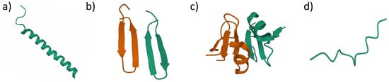 Antimicrobial peptides structural classification based on their secondary structure. (a) alpha-helices AMPs, human LL-37 (PDB ID: 2K60); (b) beta-sheets AMPs, protegrin-1 (PDB ID: 1ZY6); (c) mixed structure AMPs, human beta-defensin-2 (PDB ID: 1FD4); (d) extended structure AMPs, indolicidin (PDB ID: 5ZVN).