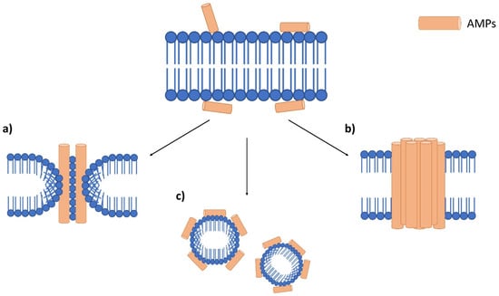 In terms of AMP mechanism of actions, it can be divided into two main categories, membrane disruptive and non-membrane disruptive AMPs [22,26,28]. Membrane disruptive AMP can be further divided into the toroidal-pore model, barrel-stave model and carpet model (Figure 3) [26,27]. The toroidal-pore model is where AMPs form pores in the membrane (1–2 nm diameter) vertically [27]. This will also cause the phospholipid head to bend due to the insertion of AMPs [28]. In the barrel-stave model, AMPs bind to the cell membrane and aggregate before penetrating the membrane [26]. During this process, hydrophobic regions of AMPs are inserted into the phospholipid membrane, while the hydrophilic regions of AMPs are facing the outer part of the membrane pore [27]. This will cause uncontrolled cellular movement for the cell, which will lead to cell death. The carpet-like model destroys the membrane in a detergent-like manner [22]. AMPs are first arranged onto the cell membrane by their hydrophobic part facing the phospholipid bilayer, which alters its surface tension. The altered surface tension later causes micelles formation as the results of peptide accumulation and destroys the membrane [22,27].