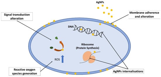 Silver nanoparticles are the product of nanotechnology which are particles of silver that are ranging in size from 1 to 100 nm [38,39]. Their nanosized greatly enhances its broad-spectrum antibacterial properties as it has larger surface area per volume ratio [29,33,35,51]. Due to their unique properties in terms of optical, electrical, magnetic and antibacterial, AgNPs have various applications, which include medical appliances, optical sensors, cosmetics, drug delivery, textiles, keyboards, wound dressings and food packaging [35,51,52,53]. AgNPs are gaining popularity due to their multiple mechanisms of action on bacteria (Figure 4), which include direct adhesion of AgNPs on the bacterial surface and altering the membrane structural integrity [32,54]. Next, AgNPs penetrate inside the bacterial cell and interact with its intracellular components, damaging it until it cannot perform vital cellular processes [32,54]. AgNPs are also able to induce reaction oxygen species and free radical generation, thus causing irreversible oxidative damage to the bacteria [55,56]. Alteration of vital signaling transduction, which is necessary for the bacterial life cycle, is also one of the mechanisms exhibited by AgNPs [52,57].