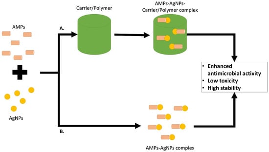 In general, AMPs and AgNPs can be combined together to exhibit synergistic antimicrobial effect or carrier/polymer can be added to the complex to allow more effective AMPs and AgNPs for the target site without exhibiting a high toxicity effect (Figure 5).