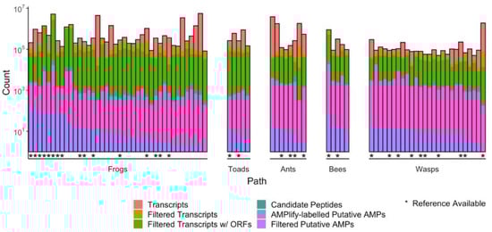 Statistics and attrition as the sequencing data are processed by the rAMPage AMP discovery pipeline. rAMPage processes RNA-seq datasets from raw reads to transcripts to putative AMPs. In this case, a putative AMP is defined as a sequence with an AMPlify score 10 for amphibians or 7 for insects, a length 30 AA, and a charge 2. Datasets with a reference transcriptome used during assembly are indicated with an asterisk. The total number of putative AMPs (n = 1478, including 341 duplicates) are shown in purple, discovered from a total of ~53 million assembled transcripts.