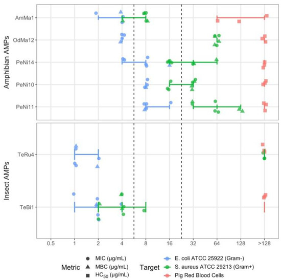 A total of 21 of the 1137 putative AMPs (Table S2) were synthesized (Genscript Biotech, Piscataway, NJ, USA) and tested for their antimicrobial activity against Escherichia coli ATCC 25922 and Staphylococcus aureus ATCC 29213 in a minimum of three independent experiments (see Figure S5 for a full set of experimental results). In these antimicrobial susceptibility tests, AMP activity was assessed using two metrics: minimum inhibitory and bactericidal concentrations (MIC and MBC, respectively). Lower MIC and MBC values are desirable as they indicate that lower AMP concentrations are sufficient for inhibitory or bactericidal activity, respectively. AMP toxicity was measured by HC50 hemolytic concentration values—the concentration required to lyse 50% of porcine red blood cells. In contrast to MIC/MBC assays, it is desirable to have higher HC50 values. All 21 putative AMPs exhibited minimal to no hemolytic activity with HC50 values of 64 μg/mL or higher.
