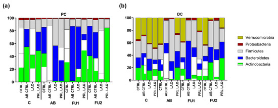 Microbial community composition as assessed via 16S-targeted Illumina sequencing. Abundance (%) at microbial phylum level in the proximal (PC (a)) and distal colon (DC (b)) reactors at the end of the control period (C), antibiotic treatment (AB) and follow-up weeks 1 (FU1) and 2 (FU2) upon lactulose administration at a dose of 5 g/d during antibiotic treatment (LAC) as well as lactulose administration during and prolonged following antibiotic treatment (PRL LAC) compared to an antibiotic control (AB CTRL) and a negative control (CTRL) (n = 1).