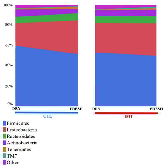 Mean percentage distribution for the top five most prevalent phyla for each sampling point by treatment group. IMT: treatment group representing cows receiving intramammary antimicrobial drug treatment at dry-off; DRY: samples collected at the time of dry-off; FRESH samples: samples collected from post-partum cows between 4 and 11 days in milk; CTL: control group representing cows not receiving intramammary antimicrobial drug treatment at dry-off.
