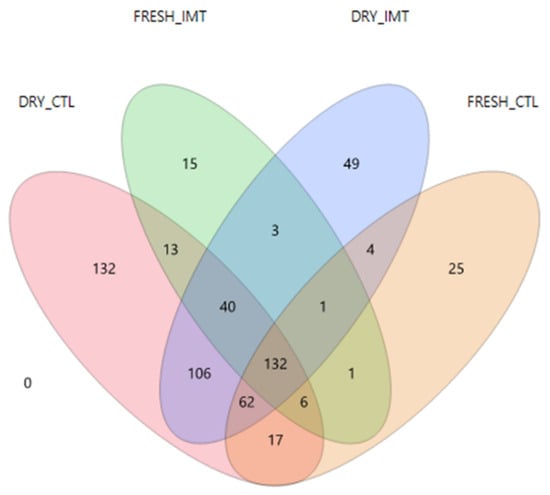 A Venn Diagram of ASVs from treatment groups for each time point displaying ASVs shared between groups is presented in Figure 2. A total of 106 ASVs were shared between DRY and CTL, and DRY and IMT, while only one ASV was shared between FRESH and CTL, and FRESH and IMT. A total of 17 ASVs were shared between DRY and CTL, and FRESH and CTL, while three ASVs were shared between DRY and IMT, and FRESH and IMT. A total of 132 ASVs were shared among all four treatment and time point combinations.