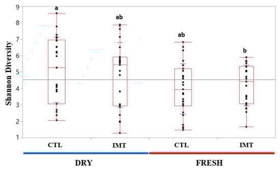 Shannon diversity quantile box plots for each treatment group for each sampling time point. Data were not normally distributed (Shapiro–Wilk p value = 0.044). Different letters (a and b) indicated treatment groups that had significantly different values based on Wilcoxon Sum Rank Test (p value < 0.05). Fresh: samples collected from post-partum cows between 4 and 11 days in milk; CTL: control group representing cows not receiving intramammary antimicrobial drug treatment at dry-off; IMT: treatment group representing cows receiving intramammary antimicrobial drug treatment at dry-off; DRY: samples collected at the time of dry-off.