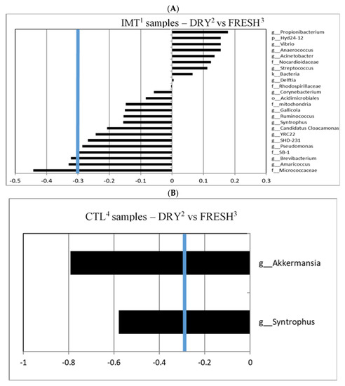 Canonical structure coefficients comparing sampling microbiota for milk collection sampling points (DRY and FRESH) by treatment group, namely cows either receiving intramammary antimicrobial treatment (IMT) at dry-off and cows not receiving IMT at dry-off (CTL). (A) Correlation between microbial taxa and the discriminant function for DRY vs. FRESH sampling points of IMT cows. Bacterial taxa with canonical structure coefficients ≤−0.3 or ≥0.3 (blue line) are considered important when distinguishing sampling times (DRY vs. FRESH) from IMT and CTL cows. (B) Correlation between microbial taxa and the discriminant function for DRY vs. FRESH sampling points of CTL cows. 1 IMT: treatment group representing cows receiving intramammary antimicrobial drug treatment at dry-off; 2 DRY: samples collected at the time of dry-off; 3 FRESH: samples collected from post-partum cows between 4 and 11 days in milk; 4 CTL: control group representing cows not receiving intramammary antimicrobial drug treatment at dry-off.