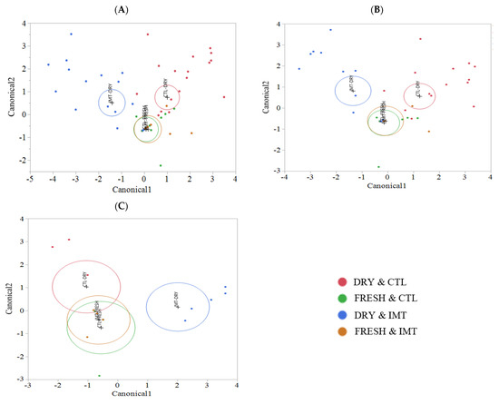 For the canonical analysis comparing treatment by time points, we observed that DRY samples collected from CTL group had a greater correlation with the genus Mogibacterium when compared to IMT samples. For DRY samples collected from the IMT group, a greater correlation with the genus Alkalibacterium when compared to CTL samples, was observed (Figure 5A). No correlations were observed for FRESH samples comparing the CTL and IMT treatment groups (Figure 5B).