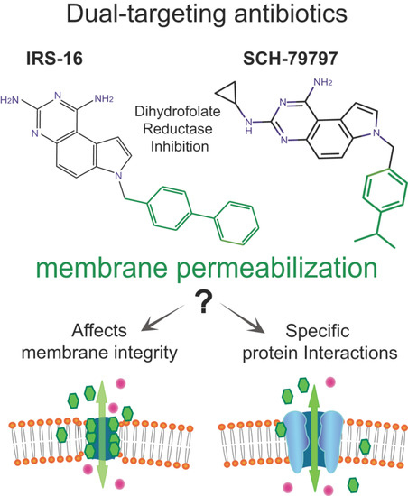 One recently described novel antibiotic compound, SCH-79797 [4], not only was effective against antibiotic-resistant strains but also proved very difficult for bacteria to develop resistance to it.A dual-targeting mechanism of action was elucidated for this compound: one is by inhibition of the dihydrofolate reductase (folic acid metabolism inhibition), and the other was simply described as an increased membrane permeability and depolarization [5]. Furthermore, a derivative, Irresistin-16 (IRS-16), had increased potency, less toxicity, and was effective against Neisseria gonorrhoeae in a mouse vaginal infection model. While membrane permeabilization was well described as one of its modes of action, the exact mechanism(s) remained obscure (Figure 1).