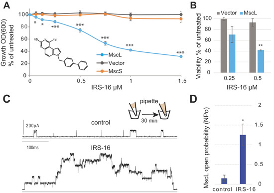 Similar experiments were performed using IRS-16, a SCH-79797 derivative with lower toxicity that is effective against gonorrhea infection in a mouse model [4,5]. Again, as can be seen in Figure 3, panels A and B, the IRS-16 in vivo antibiotic effects were clearly MscL dependent, both for growth inhibition and viability. Similar to SCH-79797, in the patch clamp experiments using native bacterial membranes, MscL activity significantly increased after treatment with IRS-16.
