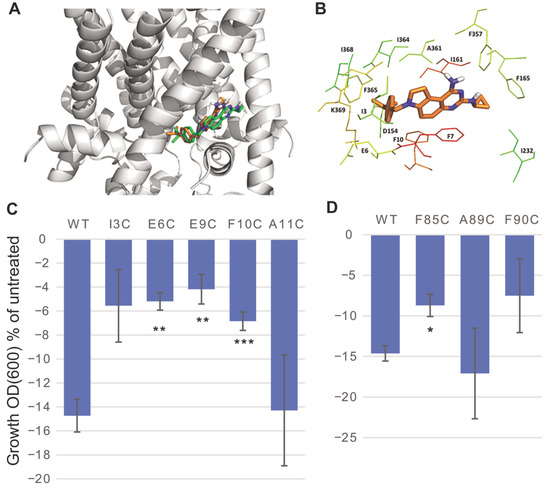Mutational analysis of some of the residues within the region was performed to experimentally test the putative binding site of SCH-79797. Some of the residues with better docking scores are known to be crucial for channel gating, leading to strong loss-of-function (LOF) phenotypes when substituted [26,27,28]. Because these LOF mutants are more difficult to gate and the results are difficult to interpret, they were excluded. As shown in Figure 4C,D, cells expressing MscL channels with mutations of several of the residues predicted to be in the region of SCH-79797 binding showed a significantly altered response to treatment when compared to WT MscL-expressing cells. E6 and F10 were also less sensitive to IRS-16 (Figure S3). These data are consistent with these residues being at or near the binding pocket and that SCH-79797 and IRS-16 have overlapping binding sites.