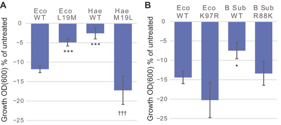 Effect of SCH-79797 on bacteria expressing MscL orthologues and counter mutants. Growth inhibition of MJF455 cultures expressing different constructs after treatment with 1µM SCH-79797, expressed as the percentage of the untreated cultures. (A) WT Eco MscL, Eco L19M, Hae WT, or Hae M19L. (B) WT Eco MscL, Eco K97R, B Sub WT, or B Sub R88K. n ≥ 3 * p ≤ 0.03, *** p ≤ 0.0002, t-test non-paired against WT Eco, ††† p ≤ 0.0005, t-test non-paired against WT Hae.
