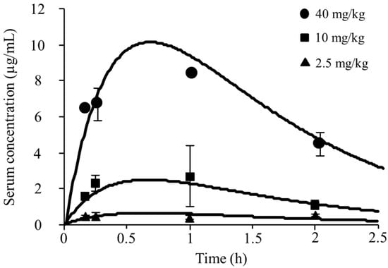 The following PK parameters, such as the absorption rate constant (ka (h–1)), the elimination rate constant (ke (h–1)), the volume of distribution (Vd (L/kg)), and AUC, were calculated based on the drug concentration data, using a standard one-compartment model with first-order absorption and elimination processes. The pazufloxacin concentration in the serum (Cp (µg/mL)) at the time (t (h)) after dosing (D (mg/kg)) were described as follows: