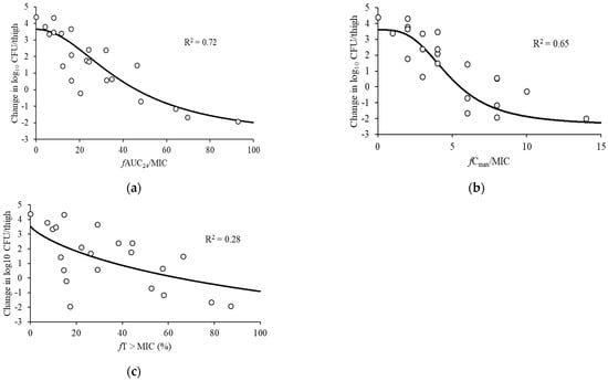 Relationships between the change in log10 CFU/thigh at 24 h and PK/PD indices. (a) fAUC24/MIC, (b) fCmax/MIC, and (c) fT > MIC for P. aeruginosa ATCC 27853. The horizontal dashed lines: organism burden at the start of therapy. Plot: mean for one thigh per mouse. R2: coefficient of determination.