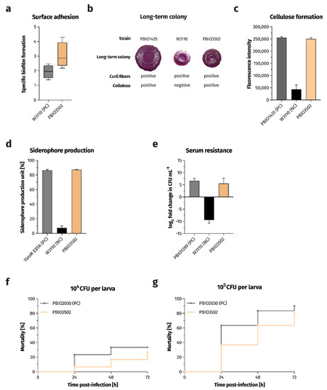 Highly virulent E. coli representatives are capable of causing bacteremia [21] and, therefore, must compete with the host defense system (e.g., the complement system). Gram-negative bacteria use several different mechanisms to deal with the immune response provided by various mechanisms, such as capsule expression [22], down-regulation of envelope stress response pathways [23], and outer membrane surface modifications [24]. Therefore, we challenged this foodborne strain by incubating it in 50% human serum for 4 h. PBIO3502 was not inhibited by the complement-containing serum and was able to double its cell number (Figure 1e). This result again highlights the highly virulent and clinically relevant nature of PBIO3502.