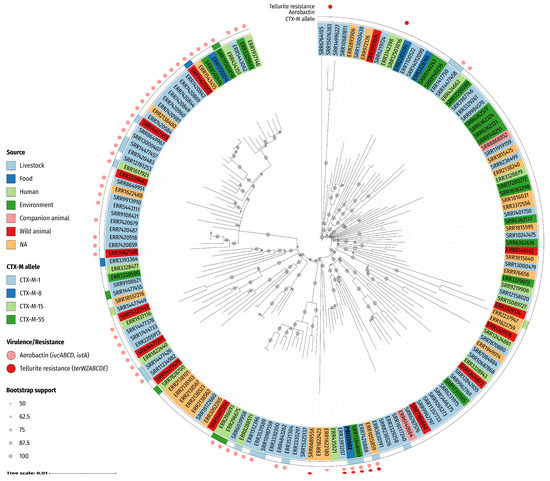 The phylogenetic tree shows that the genomes grouped into multiple clades with several subclades. Dispersed across the clades, genomes originated from humans, livestock, companion and wild animals, food, and the environment. Note that PBIO3502 clustered with three genomes from livestock (ERR3393207, ERR7420888) and environmental sources (SRR13848069), respectively. Interestingly, these closely related strains were sampled from different European locations in different years and were mainly associated with pigs. For example, ERR7420888 (designated MSG45-C09) was isolated from a healthy pig on a commercial pig farm in the Midlands of the United Kingdom in 2015 [26], while SRR13848069 (designated 20-MO00084-0) originated from scalding water from a pig slaughterhouse in Germany in 2020 [27]. All genomes assigned to the “PBIO3502 and ERR1055859 subclade” encoded aerobactin and tellurite resistance genes, a combination that was unique in the phylogenetic tree. Although PBIO3502 did not show immediate phylogenetic relatedness to human-derived strains and was in a clade primarily composed of strains from domestic and wild animals and the environment, our analysis demonstrates that phylogenetically related ST58 strains from humans were present in other clades. This again indicates the zoonotic character of the ST58 lineage and highlights the complex connections within the One Health continuum.