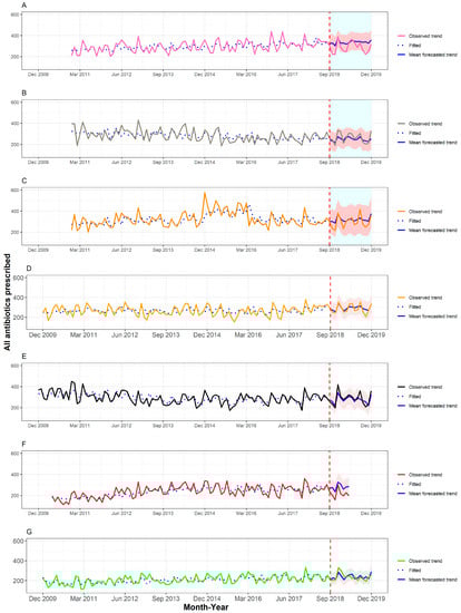 Time series for all antibiotics prescribed for adult patients across the different OOH primary care locations with CRP machines, (A–C), and those without CRP machines, (D–G). The fitted values obtained from the ARIMA models are depicted using a dotted blue line (pre-September 2018), and the forecasted mean trends are depicted using a solid blue line (post-September 2018), with the corresponding 95% confidence interval highlighted in red.