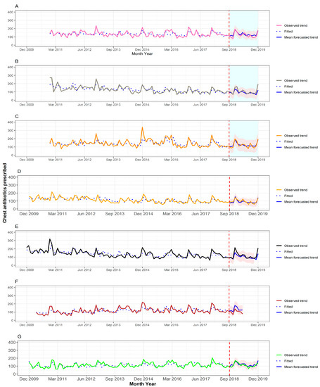 Time series for respiratory-tract-targeted antibiotics prescribed for adult patients across the different OOH primary care locations with CRP machines, (A–C), and those without CRP machines, (D–G). The fitted values obtained from the ARIMA models are depicted using a dotted blue line (pre-September 2018), and the forecasted mean trends are depicted using a solid blue line (post-September 2018), with the corresponding 95% confidence interval highlighted in red.