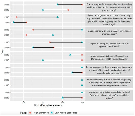 Results indicate that by 2018, there was a better understanding of the implications of AMR occurrence in human medicine than in veterinary medicine, agriculture, and/or food production. Most economies have conducted AMR surveillance systems focused on human health, and only in the high economies have surveillance systems been developed for animal health. This is similar to that reported by Founou et al. [25], who pointed out that most low–middle economies have minimal or nonexistent programs or systems to monitor antibiotic use in nonhuman health settings (veterinary medicine, food, agriculture, or environment); thus, the true burden of antibiotic use is only partially documented and depends on where the studies are conducted.