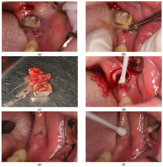 (a) Patient presented in (e), intraoral view. Visible submucosal abscess, forming near tooth 38. (b) This picture was taken after an attempt to luxate tooth 38 with a Bein root lever, resulting in the release of purulent contents. (c) Extracted tooth 38. Visible granulomatous and cystic lesions covering the tooth root. (d) situation after removal of tooth 38, resulting in complete emptying of the pus reservoir. No incision was required, and swab was taken from deep within the alveolus. (e) Patient’s clinical status at follow-up visit 7 days after extraction of tooth 38. (f) Taking a swab for bacteriological examination from the area after tooth extraction of tooth 38.