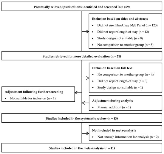A total of 169 articles were identified by the electronic literature search. Of these, 12 were retained for data extraction (Figure 1). One study was subsequently manually added as it reported novel information on the outcomes of interest in a format suitable for inclusion [14]. While all studies reported the impact of the multiplex ME panel on hospital length of stay, two studies were excluded from the meta-analyses as they did not report enough information to calculate the mean reduction in hospital length of stay [15,16]. Overall, eleven studies reported at least one outcome of interest for inclusion in the meta-analysis [14,17,18,19,20,21,22,23,24,25].