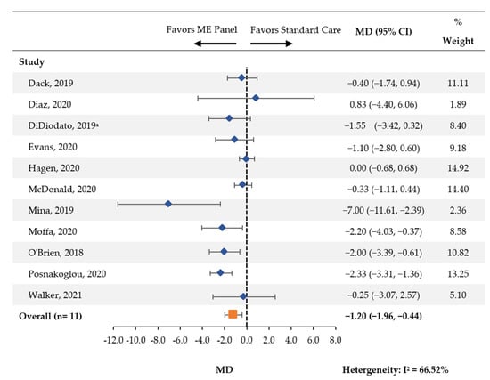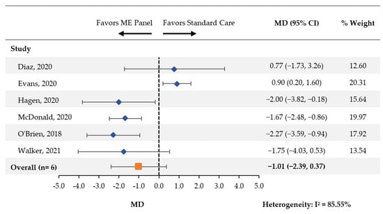 Among the three papers [19,20,21,25] that exclusively included pediatric patients, a significant reduction was also observed (MD [95% CI]: −1.73 [−2.59, −0.86]; Supplementary Figure S2). A non-significant reduction was observed in the remaining four papers [15,19,20,24] (MD [95% CI]: −0.43 [−1.60, 0.73]).