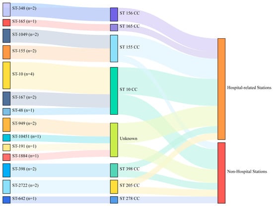 The distribution of STs from 24 E. coli in shared bikes. (CC: clonal complex, hospital-related stations represent Metro Stations nearing secondary/tertiary hospitals).