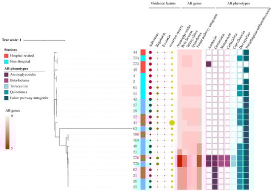 The phylogenetic tree of 24 E. coli from shared bikes. (The size of circles represents the number of virulence factors. The color of the heatmap indicated the number of resistance genes found in different antibiotic classes. Different colors were used to distinguish AR phenotypes of each antibiotic class).