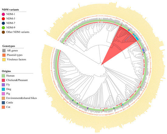 In recent years, the increasing reports of carbapenem resistance genes have increased the pressure on effective bacterial treatment. ST167 E. coli was often reported to carry carbapenem resistance genes such as blaKPC-3, blaNDM-5, and blaNDM-1 and was found in various species such as ducks, cattle, and mussels [,,,,,]. A study on hospitalized neonatal sepsis showed that E. coli (34.01%) was one of the main pathogens of neonatal bacteremia, and ST167 was the most prevalent ST []. More importantly, ST167 has been reported to spread between companion animals and their owners []. The spread of ST167 clones between countries has also been reported []. Although characterization of bacteria from shared bikes has attracted widespread attention in recent years, current studies have mainly focused on the prevalence and the phenotypes of strain descriptions in public transportation or the features of isolates themselves. To the best of our knowledge, the whole genome analysis with strains from different locations or biological sources and comparisons of their plasmid profiles are still lacking. E. coli is an important representative of Enterobacteriaceae, which can carry a variety of ARGs and has significance for public health safety. Herein, we used the E. coli isolates from the shared bikes to investigate the similarities and differences between strains from the shared bikes and other sources to find the relationship of the whole genome sequencing between the E. coli isolates from environmental and clinical samples.