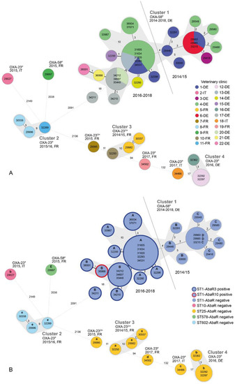 Minimum spanning tree based on cgMLST allelic profiles of 42 CP-producing A. baumannii isolates. (A) Distribution of cgMLST clusters with respect to the source of isolates regarding veterinary clinic and country (Germany = DE, France = F, and Italy = IT); (B) multilocus sequence type and presence of A. baumannii resistance islands. Each circle represents an allelic profile, i.e., complex type (CT), based on sequence analysis of 2390 target genes (pairwise ignoring missing values). The numbers inside the circles represent isolate designation. The numbers on the connecting lines illustrate the number of target genes with different alleles. Clonally related CTs (≤10 allele differences) are grey shaded and numbers of clusters are indicated. The presence of CPs OXA-23 and OXA-58 and their location (P = plasmid; CH = chromosomal) as well as the year of strain isolation are indicated. Patterns of flanking regions of the blaOXA-58 (A–D) and blaOXA-23 regions (a–e) are given above the strain names in part B of the figure.