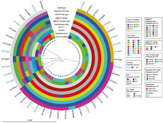 Maximum-likelihood tree of 42 genomes of carbapenemase-producing A. baumannii isolates. The phylogeny is based on 2,646 orthologous genes and was calculated by RAxML v8. Graphical visualization was achieved by iTOL v5. Colored rings represent (from inner to outer ring the (i) year of isolation, (ii) veterinary clinic, (iii) country of isolation, (iv) multilocus sequence type (Pasteur scheme), (v) international clone, (vi) core genome MLST complex type, (vii) core genome MLST cluster, (viii) OXA-51-like type, (ix) acquired oxacillinase type, and (x) A. baumannni resistance island type. Color of strain numbers indicates the origin of the isolates (green = cats; black = dogs; red = environment).