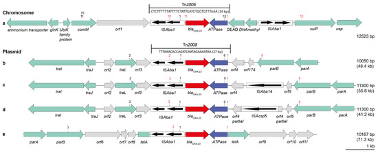 The extent and orientation of genes and open reading frames (orf) are shown by a horizontal arrow with the gene names below. The blaOXA-23 gene is shown in red, the ATPase gene in blue, orfs in grey, and other genes in light green. Insertion sequence (IS) elements are represented by a black framed box with the orientation of the transposase genes shown within. Transposons Tn2006 and Tn2008 are shown above with an arrow indicating their location. Sequences below the transposon labels indicate the distance between ISAba1 and the blaOXA-23 start codon. Primer pairs used for bridging PCRs are shown as numbers (forward primer in black, reverse primer in red) above the respective genes (Supplementary Materials Table S3). Numbers to the right indicate the size of the genetic regions displayed in the figure and the estimated total size of the plasmids (shown in brackets).