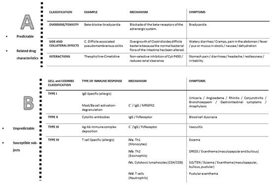 More than 80% of all adverse reactions to antibiotics comprise type A reactions, which are related to the drug’s predictable pharmacological properties. Type B reactions, which are less predictable in relation to dose and pharmacological action and represent true hypersensitivity due to idiosyncratic and individual predisposition, are less common [21,22]. Only when a definite immunological mechanism is demonstrated, these reactions should be termed as allergic [22]. The classification of type B or hypersensitivity reactions to drugs relies on the clinical presentation of typical symptoms and their timing as immediate reactions (IRs), if they occur within 1–6 h after the drug administration, or non-immediate (NIRs), whether they occur with a longer interval, usually after several hours or even days [23,24].