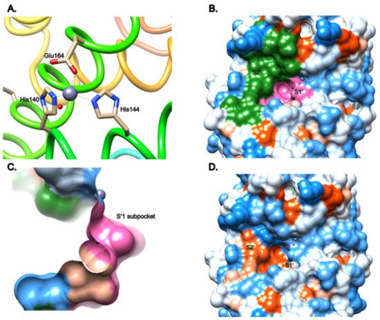 Structural description of the active site of LasB (PDB entry: 1EZM) [34] visualized using Chimera 1.15. (A) Tetrahedral coordination of the zinc cation by His140, His144 and Glu164, as well as a water molecule. (B) Visualization of the pockets S’1 (pink) and S’2 (green) surfaces. (C) Sideview of the deep subpocket of S’1. (D) Hydrophobicity of the active-site surface from blue (hydrophilic) to red (hydrophobic). These images were generated using Chimera 1.15.