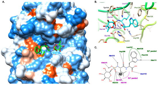 Regarding its binding mode (Figure 3), the phosphoryl moiety coordinates the zinc cation as expected, and interacts with three histidine residues (His140, His144, His223) through hydrogen bonds (Figure 3B,C). Additional hydrogen bonds are involved in the binding such as the hydroxyl and the NH of the phosphoramidate with Glu141 and Ala113, respectively, the carbonyl of the carboxylic acid with Asn112 and, in particular, the carbonyl of the amide group of 1 and Arg198 (Figure 3B,C). The tryptophan moiety is accommodated the S2′ pocket, which is lined by hydrophobic residues (Met128, Phe129, Leu197) and the isobutyl chain partially occupies a small hydrophobic cavity of the S1′ pocket (Figure 3). Later, the deletion of the carbohydrate moiety and the tryptophan replacement by phenylalanine led to compound 2, which displays a similar activity as 1 (Ki = 0.26 μM), thus demonstrating that the carbohydrate group and the hydrogen bond between the NH of the indole and the glutamate residue Glu111 are not essential for the activity [36].