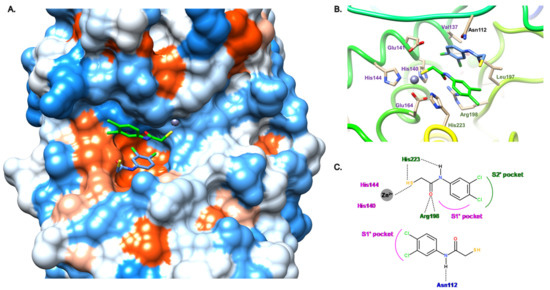 In order to target both S1′ and S2′ subsites, we attempted to merge both molecules 11a and 11b through the use of N-aryl and N-aliphatic analogs. Unfortunately, this modulation did not allow us to improve the activity of 11 as these new derivatives display IC50 values in the two-digit micromolar range [30]. However, interestingly, the introduction of the benzyl moiety in the α-position of the amide led to a slight increase in activity (compound 12, IC50 = 2.7 μM), and strikingly, improved it 13-fold when the 3,4-dichloro group was replaced by a 4-methyl motif (compound 13, IC50 = 0.5 μM) [31]. This gain in activity is explained by the fact that the S1′and S2′ pocket occupancy is crucial for a high potency of the inhibitors. As indicated in Figure 8, the enhanced occupation is mainly due to the N-aryl moiety fitting in the S2′ pocket and being stabilized by hydrophobic interactions, in particular, with Leu197, and to the α-benzyl group occupying the S1′ pocket. The strong bidendate hydrogen bond between Arg198 and the amide carbonyl oxygen atom can also be found for this α-alkyl-N-aryl mercaptoacetamide subclass (Figure 8B,C).