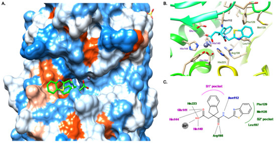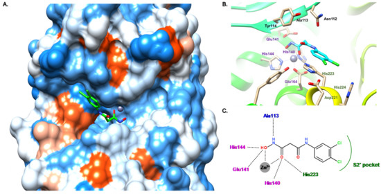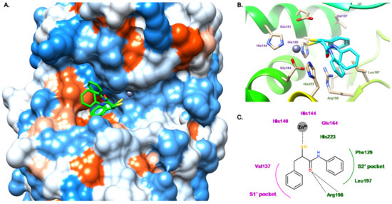 Binding mode of 16 from PDB entry 6FZX [45]. (A) View of the active site of LasB, in surface mode, accommodating 16 (green) visualized using Chimera 1.15. The zinc cation is represented as a gray sphere. (B) View of the active site of LasB with 16 (blue) and key residues (gray sticks) involved in the binding visualized using Chimera 1.15. (C) Two-dimensional schematic representation of the binding mode of 16. The key interactions are indicated as dashes, the zinc cation is represented as a gray sphere, and the key residues are indicated in pink for those belonging to the S1′ pocket, green for those belonging to the S2′ pocket and blue for the others.