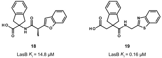 Later, the LasB inhibition through small carboxylic acid compounds was disclosed by Leiris et al. (Figure 11) [47]. They initiated a virtual screening based on the structure of LasB and ligand conformation. Regarding their structure-based approach, they have built a pharmacophore containing a ZBG, a hydrophobic moiety to mimic phosphoramidon’s isobutyl chain that fills the S1′ pocket, and at least one hydrogen bond with Glu111, Asn112 or the key Arg198. For their ligand-based approach, they took their inspiration from phosphoramidon. Seven million commercially available compounds were screened using these two complementary approaches. These resulted in the identification of hit compound 18 as a moderate inhibitor of LasB, with a Ki of 14.8 μM (racemic mixture) and, after SAR-based optimization, 19 as a highly potent inhibitor (Ki = 0.16 μM).