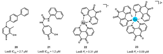 Through a screening of a metal chelator library followed by SAR studies, the Cohen and Janda groups reported the inhibition of LasB by 3-hydroxy-2-methyl-4-sulfanylidenepyridin-1(4H)-yl (20) and tropolone (21) with activities in the single-digit micromolar range (IC50 = 2.7 and 1.2 μM, respectively) (Figure 13) [46,48]. Unfortunately, our docking studies did not allow us to obtain convincing binding modes of these compounds. Interestingly, despite their limited potencies, compound 20 has a good chemical stability in bacterial culture medium (no detectable S-oxidation or decomposition over a 48 h period), whereas compound 21 exhibits a good selectivity profile (MMP-2, MMP-9, human carbonic anhydrase II and tyrosinase). More recently, Galdino et al. reported that silver and copper complexes of 1,10-phenanthroline-5,6-dione are able to inhibit LasB, in particular, the copper complex 23 with a high potency (Ki = 0.09 μM) (Figure 13) [49]. Although co-crystal structures of these two complexes with LasB are not available at the moment, docking studies were performed by the same group, which enabled us to understand their binding mode and thereby the difference in potency. Regarding the silver-complex 22, one phenanthroline nitrogen atom forms a hydrogen bond with Ala113, and three water molecules reinforce its binding to the active site by interacting with the carbonyl oxygen and nitrogen atoms of 22. However, the copper complex 23 does not exhibit the same binding to the active site and interacts with the key residues Arg198 and Asn112, justifying the difference in activity between these two metal complexes. Further investigations about their stability, solubility and selectivity are needed to consider them as drug candidates.