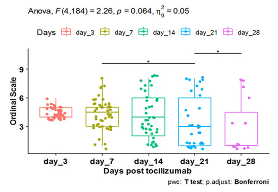 One-way Repetitive ANOVA for the comparison of the continuous WHO 8 ordinal scale at fixed time points (Days 3, 7, 14, 21, and 28) post-tocilizumab. (*: Significant Difference in the Pairwise Comparison).