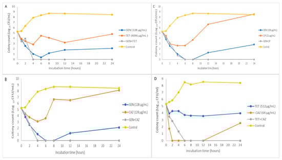 The time-kill assays (TKAs) were performed on all the synergistic combinations from the checkboard assays. For different isolates that demonstrated synergy to the same antibiotic combinations, only one was selected for the TKA. The kill rate was determined by enumerating the viable cell counts at specific intervals over 24 ± 2 h. The MICs of each antibiotic alone and the combined antibiotics at 20 mL each were investigated in a 100 mL conical flask. Then, 200 µL of the adjusted 0.5 McFarland inoculum was added to 20 mL of 2× MHB to produce a final concentration of 5 × 105 CFU/mL when added to the antibiotics to be assayed. The cultures were incubated at 35 ± 1 °C with shaking at 120 rpm. Aliquots were removed from the cultures at 0, 1, 2, 4, 6, 8, 12, and 24 h and a 10-fold dilution series was performed in sterile 2× MHB. A 100 µL of each appropriate dilution was spread on MHA plates in triplicates. The plates were incubated at 35 ± 1 °C, and colony counts were recorded after 24 ± 2 h. A growth control was run in parallel with each experiment. The time–kill curves were determined by plotting the mean colony counts (log CFU/mL) against the incubation time (hours). The combination’s efficacy was synergistic when viable bacteria were reduced by ≥2 log10 CFU/mL compared to the most active single antibiotic. The combination therapy’s efficiency was also evaluated as bactericidal when there was a ≥3 log10 CFU/mL reduction compared to the initial inoculum at 24 ± 2 h.